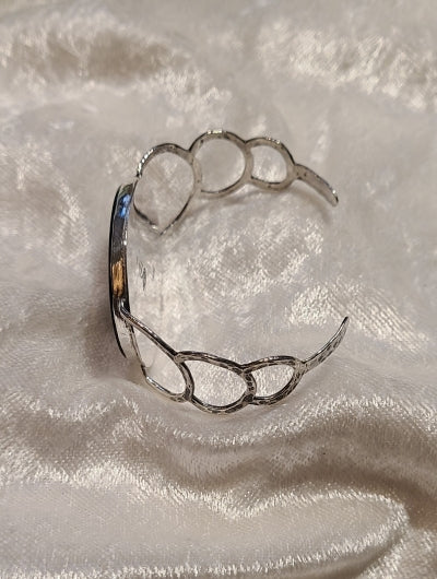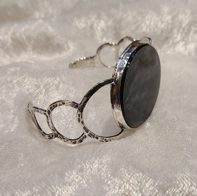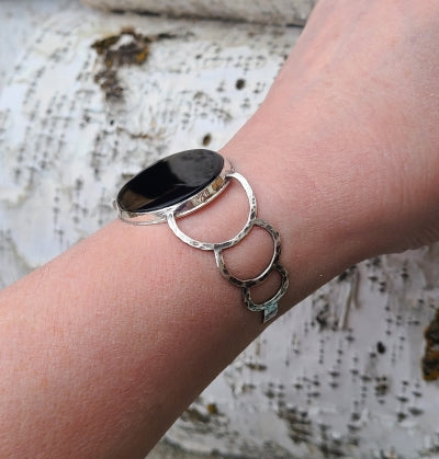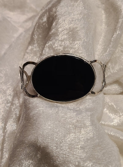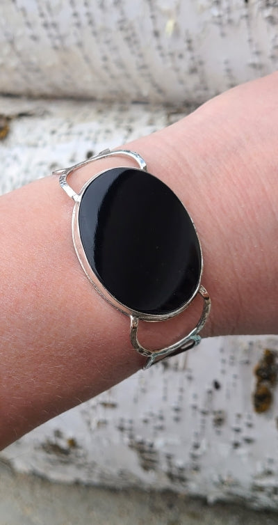 A highly polished Black Onyx cabochon is the focal point of this especially eye-catching sterling silver bangle. Black Onyx has been used as a powerful grounding stone that heightens focus, protection, and a sense of safety, making this bangle perfect for anyone wishing to conquer fears and bravely move toward achieving goals. The sterling silver components of this bangle have been hammered and antiqued to bring forth a glistening texture to further highlight the cabochon. Elegant and attractive, this bangle works with any outfit!