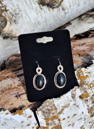 Jenn has handmade these unique earrings using sterling silver and 13 by 18mm, deep-blue Tiger eye cabochons. The healing properties of blue Tiger eye have been well known to harness vitality and to bring emotional perspective to the wearer, especially in chaotic environments. These earrings will be an excellent and striking addition to any outfit!
