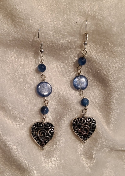 Silver hearts hang beneath blue Kyanite beads of both round and lentil styles in these elegant and charming 3-inch earrings. Kyanite is well associated with focus to transform ideas into desired circumstances, especially when seeking a solution to a problem. It is also a stone used for relaxing the wearer, bringing calm when suffering from anger or other inflammatory emotions. Kyanite’s natural blue iridescence reflects light so beautifully, it makes these earrings eye-catchingly stunning!