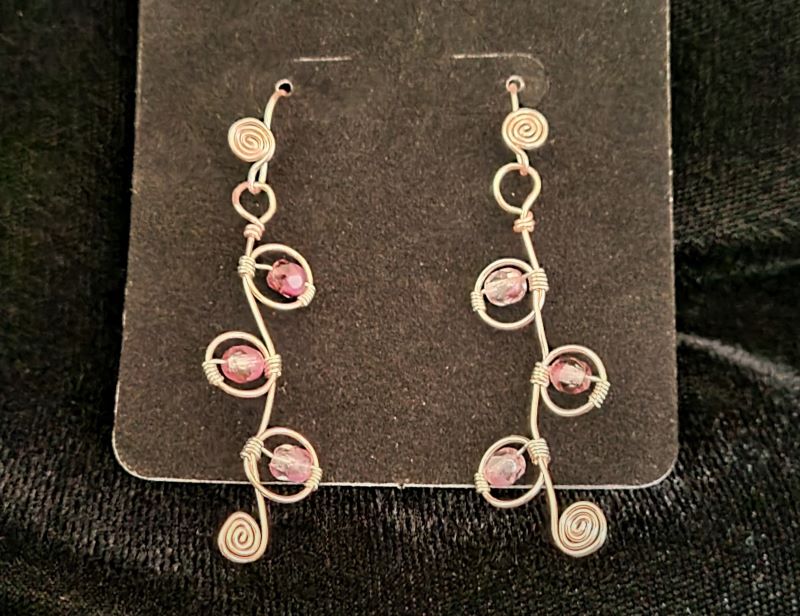 These unique earrings feature delicate wire wrapping using rose and silver wire combined with beautiful faceted amethyst beads. Expertly crafted and eye catching, they make a statement of style, elegance, and sophistication.