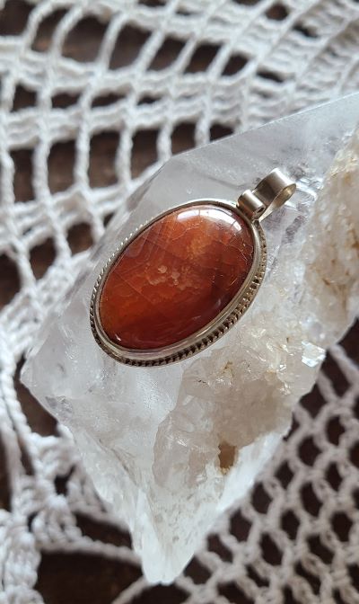 This 1½“ x 1” Carnelian pendant is intricately crafted and smithed in sterling silver with a rope accent and a decorative double-loop bail. This beautiful piece showcases the diversity of Carnelian presentation with dark and light orange hues intermixed with white and dark banding. Not only beautiful, Carnelian is said to provide enhancement of meditative states, self-esteem, creativity, inner peace, and physical energy with diminishment of insomnia and feelings of inadequacy, making it a much sought after body adornment. Another design out of Jenn’s Earth offering an exquisite and unique decoration that won't go unnoticed.