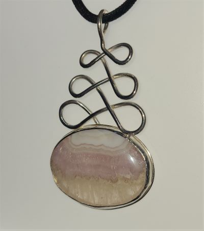 White and lavender bands and encased crystals are clearly visible within the Purple-lace Agate in this handmade pendant. The Purple-lace Agate cabochon is held with an infinity-style bail of sterling silver designed in Jenn’s Earth, making this striking pendant 2½” long and 1½” wide to beautifully hang from your favorite chain. Agate is known for its calming effects, mitigating anxiety and insomnia, and promoting relaxation. However, the added benefits of wisdom, insight, confidence, and clarity of mind as well as relieving emotional baggage, reestablishing harmony and balance, and fostering healing are associated specifically with Purple-lace Agate. The open back of this pendant allows light through, revealing the inner glow of the wearer.