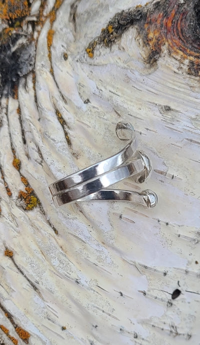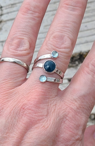 Experience the beauty of this sterling silver ring (size 9), featuring a brilliant Apatite cabochon accented with vibrant Blue Topaz. Jenn uses Apatite and Blue Topaz in this ring to symbolize and amplify the qualities of this special combination of stones, namely clarity, acceptance, creativity, health, communication, and consciousness. Perfect for those who seek inspiration and who appreciate a unique and eye-catching design.