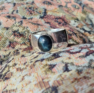 Jenn designed this handsome and hearty ring (size 13) with masculine energy in mind. A 12mm by 10mm Tiger Eye cabochon surrounded in sterling silver flashes and shimmers various shades of blue when turned in any light. Blue Tiger Eye (also named hawk’s eye) is known to help calm mental chatter to focus insight and help the wearer read between the lines of any situation, especially of difficult situations and people. A protective stone, blue Tiger Eye beckons a less-used ability to observe a situation with greater clarity to find its truth and to hear what is not being said. A handsome and intriguing creation out of Jenn’s Earth!